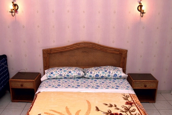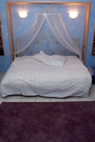 الدرج الحديد الأزرق المزخرف يقود إلى الطبقة العلوية، وقد توزّعت على طول الجدار لوحات ومرايا عدة بأطر متميّزة من الخشب المحفور. في هذه الطبقة غرف النوم غلبت عليها البساطة في خشب الأسرّة، ولعلّ أكثر ما يميّزها هو جدرانها التي اكتست بقاشّ مزخرف، مقلّم حينا ومعرّق حيناً آخر. وثبّتت فوق السرير مصابيح تبعث أنواراً تناسب المكان. وفي إحدى الغرف طغى اللون الأزرق على الجدار خلف السرير الذي بدا يستريح ضمن إطار من خشب يعلوه مصباحان إنسدلت تحتهما ستائر بيض شفّافة.