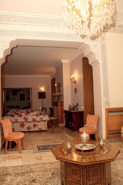 ولأنّ للإنارة دوراً أساسياً في المنزل، فقد تدلّت الثريات الكريستالية في سقوفِ معظم الجلسات. وأما الباب الفاصل بين الصالونين، فهو عبارة عن إطار من الجفصين الموشّى بألوانٍ عدة، وهو ما يعتبر ميزةً هندسية مغربية إلى جانب الحجر الموزاييك المتعدّد الألوان. ولا تخطئ العين مجموعة الأكسسوارات المزروعة على الطاولات وفي الزوايا، لعلّ أبرزها تمثالان يجسدان رجلاً وإمرأة بثياب من الكريستال الـ «مورانو» الفاخر، وقد أتى بها المالكون من رحلة إلى إيطاليا وتحديداً البندقية.