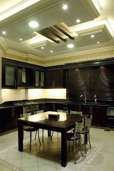 وفي وسط المطبخ طاولة، يعلوها سقف من الجص والخشب مع إضاءات مخفية.