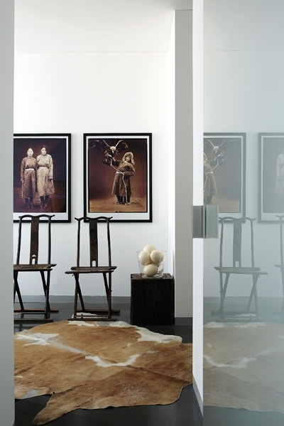 والمكتب تحتله طاولة اجتماع كبيرة من تصميم «زويبريتز» تحيطها كراسٍ مستعادة من السبعينات تحمل علامة «كنول»، وقد توزعت فوق الأرضيات في كل مكان من اركان الشقة بعض قطع من السجاد المصاغ من جلد البقر.