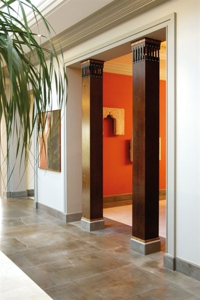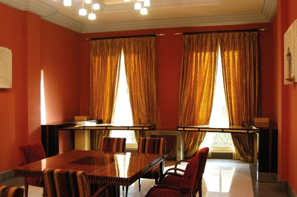 واستكمل جص السقف بما يماثله على الحائط حيث ارتسمت مربعات كبيرة بإضاءة غير مباشرة استراحت فيها القطع الحجر الأثرية من المجموعة نفسها لبقية القطع التي توزّعت في أرجاء الجلسات.