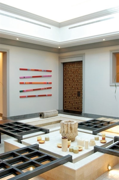 وبالعودة إلى قاعة الإستقبال، يجد الزائر نفسه، ما إن يدخل، أمام إتجاهين، كل منهما يقود إلى عالمٍ بذاته من الديكور المتفنن والأثاث الإستثنائي. فلجهة اليمين الصالونات التي تحدّثنا عنها. أما في الوسط فيستقبلنا بهو فسيح مخصّص للراحة وللعب الأولاد. الراحة مصدرها خضرة الشجر ونافورة المياة كأننا في حديقة. وزادت الديكور جمالاً المقاعد المتحركة حول المياه والتي يمكن التحرك بها كيفما يشاء أهل البيت.