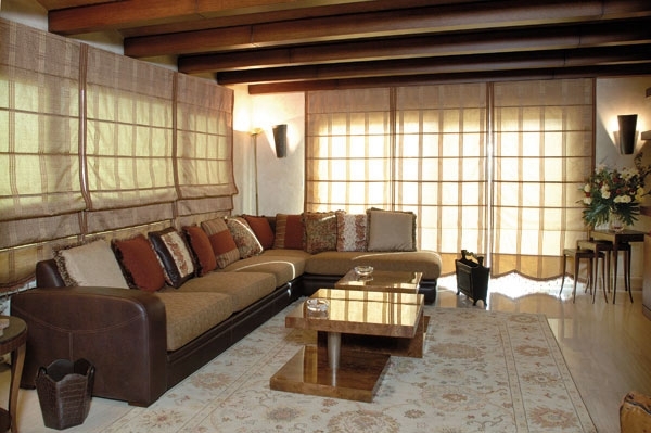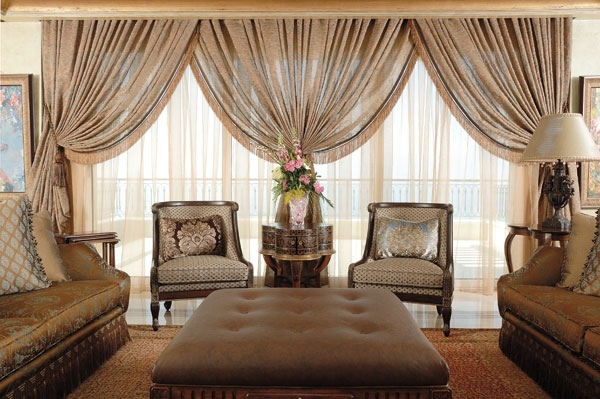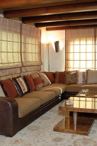 الستائر الحرير تبعت التصميم نفسه في الطبقة الأولى، فهي متداخلة ومتدلية كالشلالات من البني الزاهي والأزرق من القماش الشفاّف لكي لا تحجب المنظر البانورامي الأخاّذ الذي تطلّ عليه هذه الفيلا.