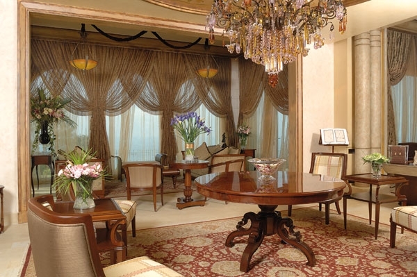 وننتقل إلى صالون جديد لا يقلّ روعة. بسيط وفخم في آنٍ واحد، وستائره منسدلة كالشلالات. هنا للجلسة حميميتها وخصوصيتها بإعتبار أن هذا الصالون هو الأخير في طبقة الإستقبال.