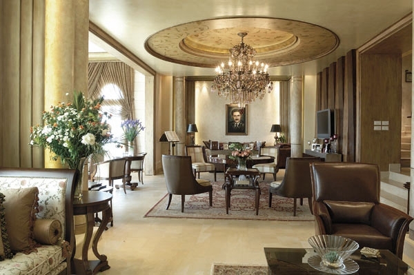 خطوات قليلة ونبلغ جلسة أقامت في وسطها طاولة مستديرة وأحاطت بها المقاعد الوثيرة. ومن السقف تدلّت ثريا ضخمة تملأ المكان نوراً، ضمن دائرة من الجفصين، كأنها انعكاس للطاولة المقابلة، أو العكس. وفي كلّ ردهة اتخذ الجفصين شكلاً ولوناً مختلفاً. فهو تارة ذهبي، وتارة أخرى معتق، وطوراً مرسوم باليد، وفي كلّ الحالات مرهف.