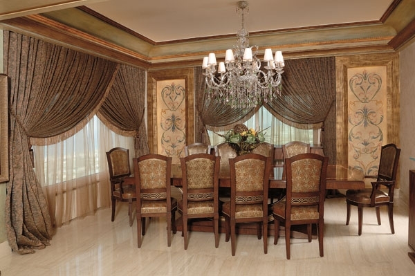 وهنا للجفصين الملوّن حصّة في إكمال لوحة الفخامة، إذ احتلت صدر غرفة الطعام لوحتان لجهة اليمين واليسار مستطيلتان، إطارهما باللون البرونز الذي حدّد بدوره الجفصين في السقف، فاستكملت اللوحة بين الجدران والسقف بطريقة متكاملة ومتناغمة. الطاولة الكبيرة وحولها المقاعد من القماش من مشتقات البني والبيج، لتستوعب أكبر عددٍ ممكن من الضيوف في الموائد الرسمية.