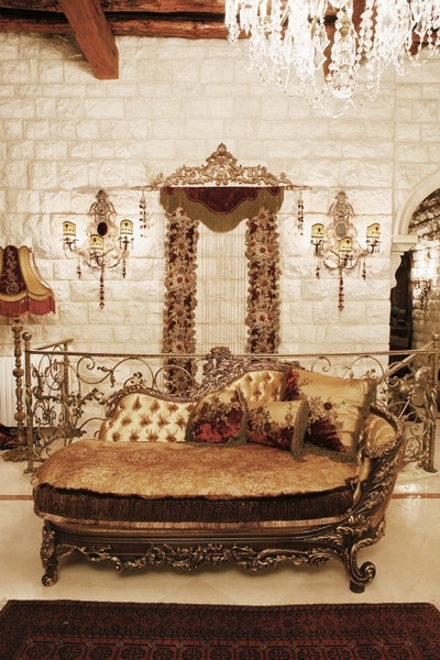وتوزعت الجدران من الحجر المدقوق وازدانت بـ «أبليكات» من قماش مطرز، منها تعانق مرايا وأخرى طرابيش خاصة. كما عُلقت لوحات كلاسيكية تحاكي أناقة السيدات الفرنسيات، وهي تعود إلى عصر النهضة الأوروبية.
