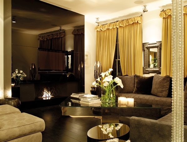 وتضفي ستائر الساتان بلونها الأصفر على هذا الصالون رونقا مدهشا تعززه اضواء حالمة، تنبعث من خيوط الكريستال الموزعة في المكان كشلالات من الضوء، يمكن التحكم في نورها حسب المزاج لصنع المزيد من الأجواء بتاثيرات مدهشة.