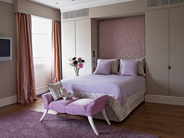الستائر رمادية من التفتا، اما المقاعد الصغيرة وصندوق السرير فقد نجدت بنوع من القماش المزخرف، من ابتكار