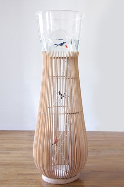 ومن المبتكرات الجميلة التي تجمع بين شاعرية اللحظة وروعة الالهام تحملنا المصممة «كونستانس غيسيه» الى عالمين هوائي ومائي، يندمجان في تحفة تحمل اسم «دوبلكس» وهي تعبر عن مواجهة ولقاء غير محتمل بين الطيور في قفص والأسماك في اناء ماء، وجها لوجه في فضاء داخلي لا يمكن تصوره...