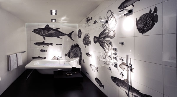 من الأجواء الغريبة اللافتة أيضاً كان تصميم لصالة حمام تقليدية تسقط فيها الاضاءة والتلاعب بالتاثير الى قعر المحيط وسط غابة من النباتات البحرية والحيوانات والأسماك بالحجم الطبيعي.