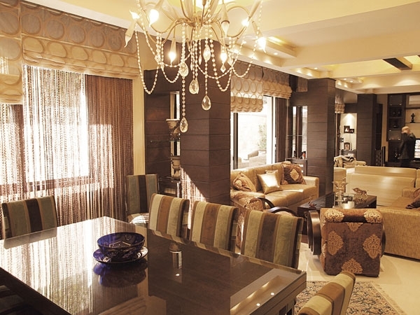 وأضفت الستائر الحرير بألوانها المتجانسة مع أثاث المنزل، جواً رائعا على الصالونات، علماً أن تصميمها يسمح لها بأن تختفي في السقف تاركة المجال للعين حتى تتأمل الخضار من خلال الواجهات الكبيرة. وقد استعان مهندس المنزل بشتول دائمة لخضرة للحفاظ على الجو نفسه صيفاً وشتاءً.