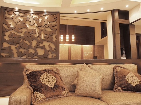واتسمت قاعات الاستقبال بالهدوء نظراً الى ألوان الأثاث الترابية المتجانسة مع الخشب «الفينغي» الموجود بوفرة في هذا المنزل. فأحد جدران الصالونات ارتدى حلة من الخشب، وشكل فاصلًا بين الصالون وغرفة الاستقبال، وطعّم وسطه بلوحة متحركة من الخشب المحفور بالزهور، عبارة عن رسمة يابانية كسرت رتابة الخشب.