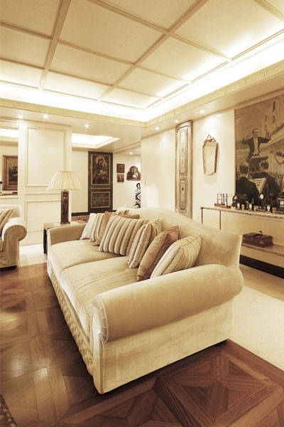 أما الصالون الثاني فهو أيضاً من القماش الدان «ألكانترا» زيّنته أرائك مقلّمة باللونين البني والبيج، وهو عبارة عن ثلاثة مقاعد بالحجم والتصميم نفسه، توسّطته طاولة مربّعة تطعّمت بالبيج تجانساً مع لون قماش المقاعد. وكما الصالون الأوّل الذي اكتمل تصميمه بمقعدين منفصلين لافتين، اكتمل تصميم هذا الصالون مع مقعدين مميزين إرتكزا على قاعدة مستديرة باللون البني. ولتكتمل اللوحة الجمالية إلى جانب زخرفة السقف الذي هو عبارة عن مربّعات من الجفصين، انبعثت الإنارة غير المباشرة، وتخلّل الرخام البيج في وسط الصالون الثاني باركيه تداخلت فيه ألوان الخشب، مصمّم على الطريقة الفرنسية.