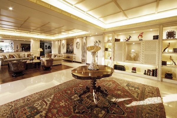 مساحة كبيرة تتسم بالهدوء والبساطة تفصل بين الصالونين، حيث تربّعت طاولة فاخرة إنكليزية الصنع على سجادة قوقازية فاخرة، وهو النوع نفسه الذي افترش أرض المنزل كلّها بألوان وأحجام مختلفة. أما الجدار الفاصل بين الصالونين فهو كناية عن مكتبة من الخشب البيج إستكمالاً لجدار التلفزيون في الصالون الأوّل، وضعت في داخلها كتب وقطع فنية أبرزها من زجاج المورانو وتمثال من الحجر المنحوت.
