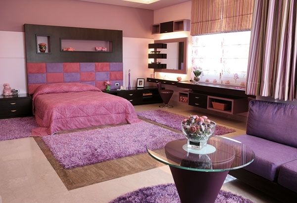 اللون البنفسجي رافقنا إلى الطبقة الثانية المخصّصة لغرف النوم. فغرفة نوم المالكين أتت مزيجاً من اللونين البني للخشب والبنفسجي للقماش، إلى جانب اللون الفضي في إطار السرير. كما أن مزيج الألوان الثلاثة للرخام إنتقل أيضاً إلى هذه الغرفة، ولكن بتصميم مختلف عن الصالونات. وإلى جانب هذه الغرفة غرفةٌ طغى عليها الخشب، مخصّصةٌ للملابس نظراً إلى كثرة الخزائن. أما الحمام فضمّ جاكوزي بشكله المستدير وتزيّن بثلاثة ألوان من الرخام.