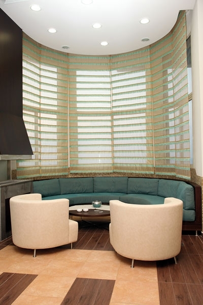 ويقابل هذه الجلسة ما يوازيها روعةً وتفنناً: أربعة مقاعد من الجلد تتوسطها طاولة، وتزين المكان مدفأة وواجهة ضخمة من الزجاج، تضيء الصالونات وتظهر فخامتها أكثر بفضل الستائر الحرير المنسدلة من السقف كأنها شلال من البلور، على غرار الجلسات الأخرى.