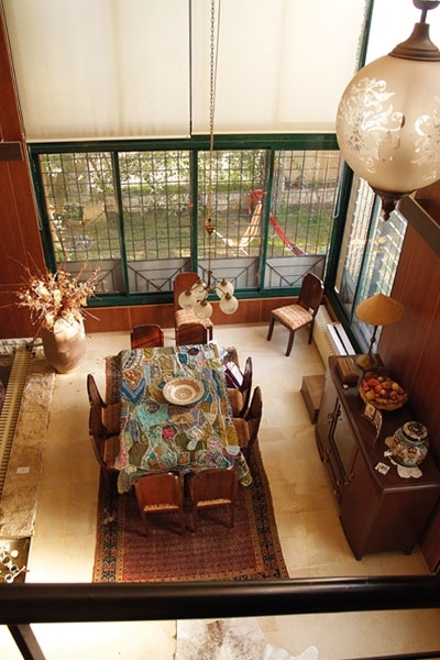 الزجاج تزيّن من الخارج بالحديد الأسود المقسّم إلى مربعات، فشكّل عنصر حماية للمنزل، ولم تسدل هنا الستار كما في الصالونات، إفساحاً في المجال أمام شعاع أكبر من الضوء. وإذ انسدلت الستائر في بقية الجلسات، فقد صمّمت بطريقة بسيطة واتسمت بلونها الأبيض. وأضاءت وسط الطاولة ثريّا تدلّت من الطبقة الثانية عبارة عن أربع كريات بيض.
