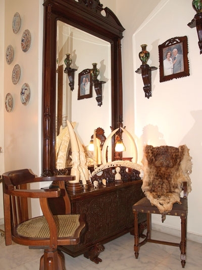 هذا الطراز من الكونسول الذي تعلوه مرآة تكرّر في زاوية غرفة الطعام، ولكن وضعت عليه مجموعة من قرون العاج تماشت مع شلحة من فروة ثعلب وضعت على كرسيّ إلى جانب الكونسول.