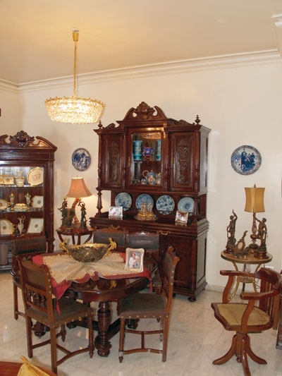 إذاً، وفي طريقنا إلى الصالون الثاني مجموعة من القطع الفاخرة من الفضة من صحون وأوان للاستعمال وللزينة معاً، وضعت داخل فيترين متميّزة في شكلها النادر من الخشب المحفور بخيوط منسقة واجهتها من الزجاج، وتزيّنت بتماثيل من الخشب الصغيرة وضعت عليها من فوق.