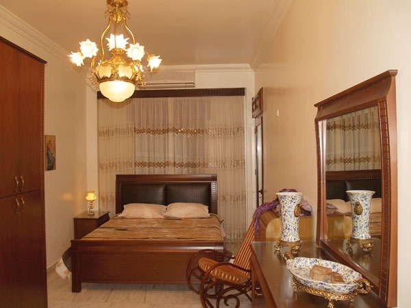 وفي إحدى الزوايا علقت ثلاث أيقونات يعلوها رفّ ذو قنطرة من الخشب المزخرف، يحمل ثلاثة أطباق دائريّة للديكور. وتحت الرّف إزدان المكان بمزهريّات «سيفر» ارتفعت على طاولة صغيرة. وعلى مقربة، خزانة ضخمة من حلب تتوسّطها مرآة. ومن السقف، تتدلّى ثريّا نحاسية تضفي على الجلسة إنارة دافئة، تزيد البلاط الرّخاميّ الأبيض بريقاً.