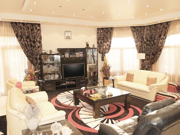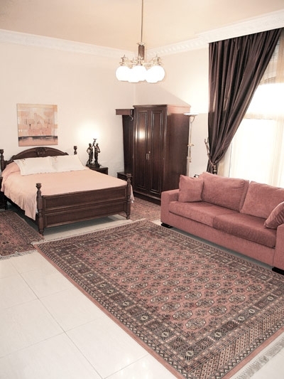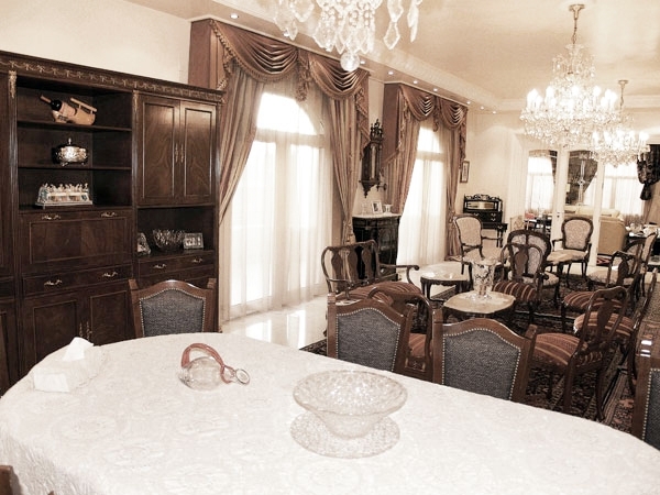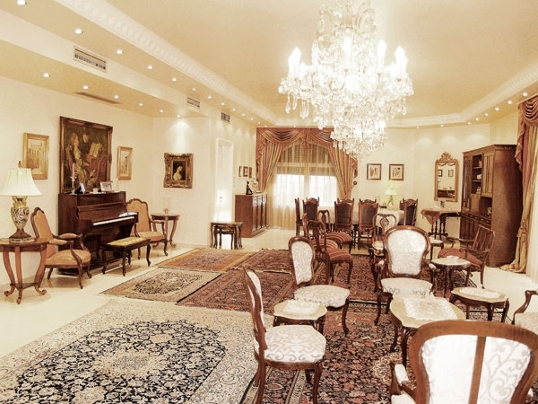 باب من البلّور يطالعنا بعد الصالونات ويقودنا إلى عالم العصرية حيث غرفة الجلوس، التي طغى عليها اللونان الأبيض في القماش الجلد للمقاعد والأحمر من خلال السجادة العصرية التي امتزج فيها الأسود والأحمر والأبيض، على خلاف سجاد الصالونات الذي أتى مزيجاً من الأصفهاني والكاشان والنايين والأفغاني.