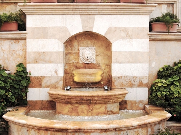 وقبل الدخول أيضا لا بدّ من التوقف عند نافورة الماء التي زيّنت الحديقة وأنعشتها، خصوصاً في فترة الصيف، وقد صمّمت بحجر مميّز ومعروف في حلب بأنّه يستخدم في القصور الحلبية العريقة للزخرفة، ويسمّى "البقدونسة".