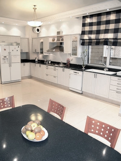 في هذه الطبقة أيضاً المطبخ العصري الذي اتسم بألوانه الزاهية، وازدان بالخزائن من الخشب الابيض، أما الغرانيت فهو باللون الأزرق تداخل معه الأبيض.