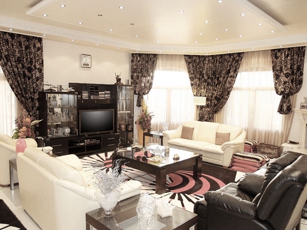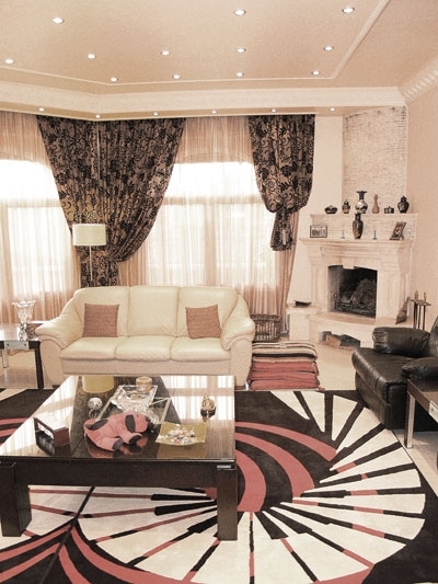 ولإضفاء أجواء خاصة، احتلت زاوية غرفة الجلوس مدفأة من الحجر الأبيض. كثرت في هذه الجلسة الأبواب والنوافذ التي انسدلت من أمامها الستائر باللونين البني والأسود.