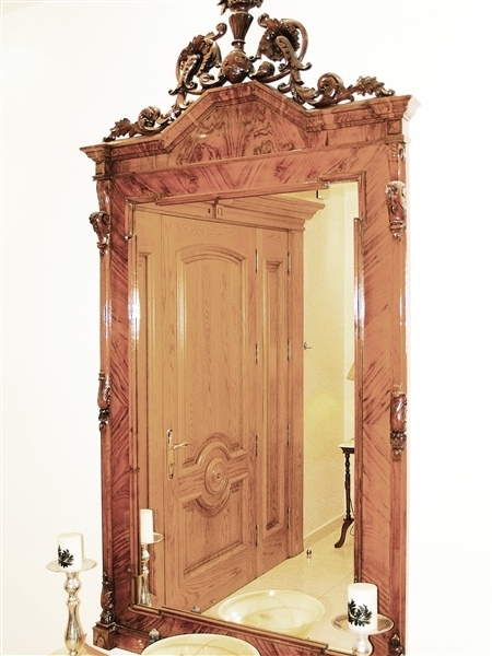 وقبل المغادرة لا بدّ من التوقف في غرفة الإستقبال حيث كونسول من الخشب تعلوه مرآة إطارها مزخرف تعود إلى مئتي سنة، حافظ المالكان عليها وأعطياها أهمية بحيث أنّها أول ما يطالع الزائر.
