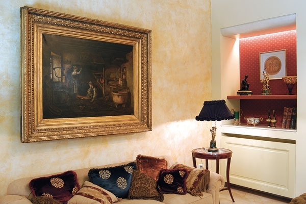 وتطالع الزائر لوحة للفنان الفرنسي أنطوان باي تربّعت في وسط الجدار، تجسّد وجوهاً وأشخاصأ. وتعمّد المهندس الإكثار من هذه اللوحات التي تجسّد وجوهاً وبورتريه لكي يحسّ الزائر كأنّ المنزل مليء بالناس، ولا يشعر أهله بالوحدة بلّ بحياة دائمة. في هذا الصالون فجوات في الحائط الذي إرتدى حلّة من الخشب الأبيض والقماش البوردو، إنبعثت من خلفه الإنارة، واستلقت على رفوفه مجموعة من الكتب أو القطع الفاخرة. الطاولة الخشب في الوسط تزيّنت بقطعة من كريستال بوهيميا الفاخر بالألوان الأزرق والأبيض والبوردو. ولا بدّ من التوقف ملياً عند مصباحين على الطاولتين في الزوايا، قاعدتاهما من البرونز تجسدان طفلاً واقفاً على قاعدة من الرخام ذات قيمة تاريخية، صمّم لهما المهندس قماشاً خاصاً.