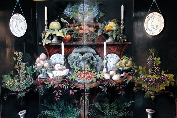 فهنا سرير بلدقاني مغروس في الحديقة تعشش فوق أغصانه الطيور، وتلك زهرة بنفسج تحولها المخيلة السحرية الى كرسي مدهش الألوان، بينما تعرش على بعض ألواح الزجاج نباتات غريبة، لتكون منه حاجزاً زخرفياً جميلاً تتسلّل من بين أغصانه الوهمية أشعّة الضوء بتأثيرات جميلة غير منتظرة.