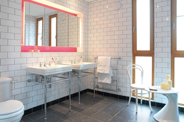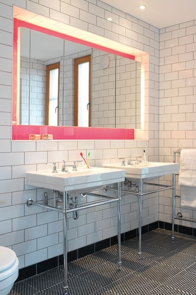 وفي بعض الحمامات ذهبت نحو الألوان الباردة مع معدن الكروم، بينما خصصت لحمام آخر معالجة زخرفية باللونين الزهري للمرآة والأسود للأرضية المصنوعة من الكاوتشوك المزخرف.