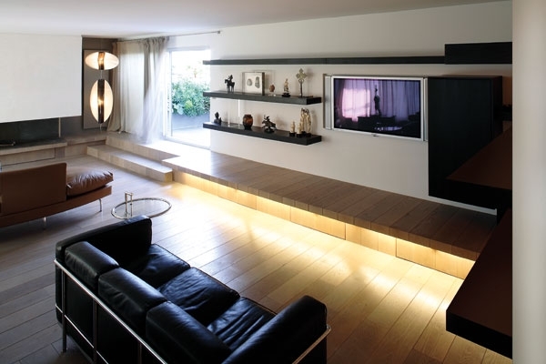 والرف الأسفل اتخذ لون خشب أرضية الشقة (الباركيه) ويمكن الإستفادة منه بالإضافة الى خاصية العرض، بتحويله الى مقعد يتّسع لجلوس أكثر من خمسة أشخاص.