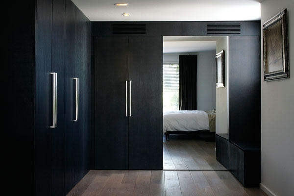 وقد تم تأثيثها بصوفا جلدية حديثة من تصميم جيزار تعلوها لوحة كبيرة، بينما خلت المساحة من أي عنصر آخر للأثاث، حيث يمكن من خلال باب فيه الوصول الى غرفة النوم التي يشكل مدخلها غرفة للملابس بالغة الأناقة، تغطي خزائنها الخشبية الداكنة والمدمجة جدرانها، وتقود الى غرفة نوم بسيطة وأنيقة ولا تختلف بخطوطها عن بقية عناصر الشقة.