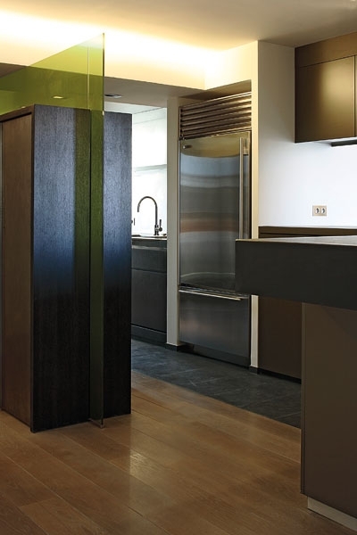 وتنتهي رفوف الجدار بعنصر أثاث يتبع لها، وهو على شكل خزائن معلّقة.. والمجموع من تصميم أريك جيزار. وفي مقابل جدار الرفوف وضعت كنبة جلدية سوداء من طراز الأندية الإنكليزية، ولكنها بتصميم حديث.