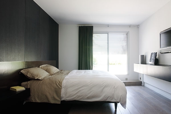 ويتوسط الغرفة سرير عملي أنيق يتصل بأثاث خشبي معلّق يشكل امتداداً لأثاث غرفة الملابس. ويوفر إضاءة مخفية للسرير الذي تحيطه طاولتان منخفضتان (كومود) تعلوهما بعض الكتب.