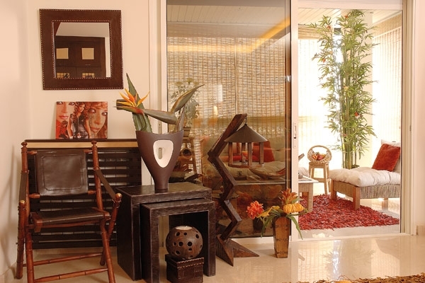 رواق صغير يفضي إلى صالون وغرفة طعام، توزع في الأول طاقم بديع من الجلد البرتقالي مع قماش لبعض الوسائد باللونين البني والعاجي.