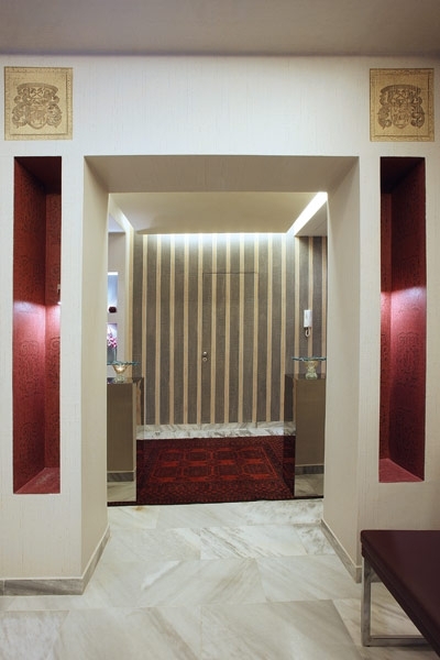 ولتحديد تصميم المساحة الداخلية للرواق وُضعت تجويفتان وتم طلاؤهما من الداخل مع إبرازهما باللون الأحمر. وعند أعلى كل تجويفة علقت لوحة من الموزاييك.