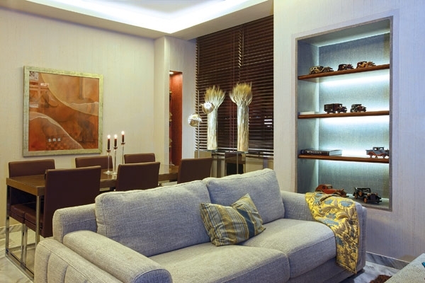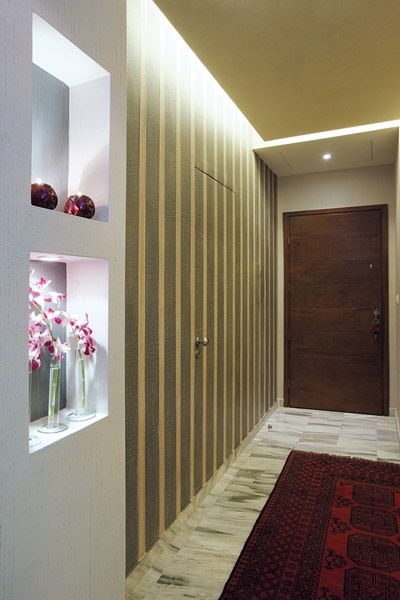 برزت أعمال «الزن» أثر الدخول الى هذا المنزل، فالجدران صممت لتعطي بعداً وآفاقاً عبر أعمال مخططة بالطلاء بشكل عمودي وبألوان عصرية من البيج والرمادي مع تدرجاته الضاربة إلى الفضّة.