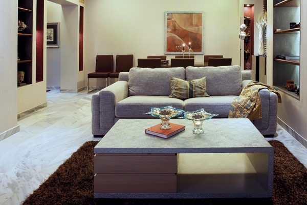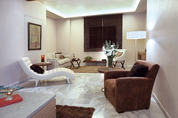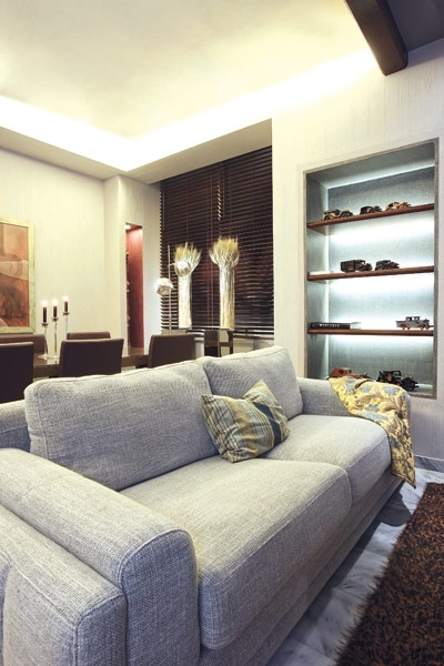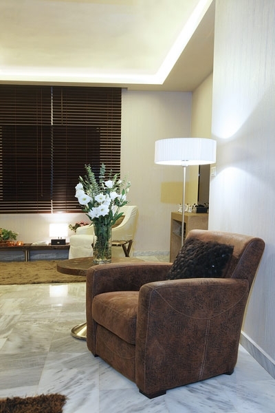 اما الصوفات الكبيرة فتم تنجيدها بقماش «شانيل» الراقي بلون رمادي، إضافة الى كرسي طويل من الجلد الطبيعي الابيض، تعلوه لوحة عصرية .