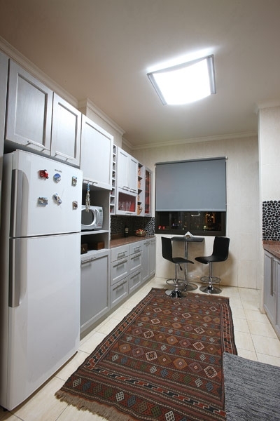 وقد صُمم المطبخ لاحتضان اكبر عدد من الخزائن. كما أقيمت جلسة صغيرة قرب نافذة تشرف على البحر.