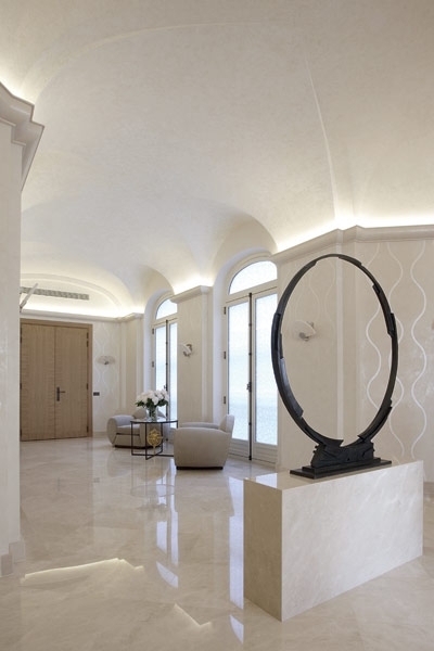 هذا المدخل المهيب يفتح وبشكل مسرحي على صالة الاستقبال، مضاعفة بذلك أبعاد المنظور.