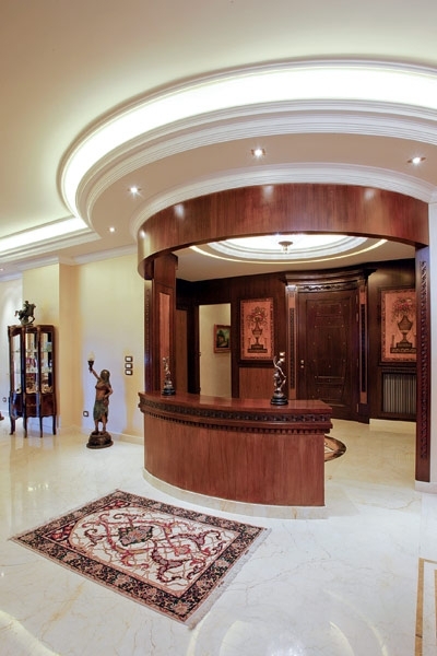 من المدخل الرئيسي نرى غنى التفاصيل الهندسية الذي يعكس مستوى التصاميم المتوقعة في الداخل بحيث لا يتوانى المهندس عطالله عن وضع بصماته على أي من التفاصيل الهندسية والتزيينية لهذا المنزل .