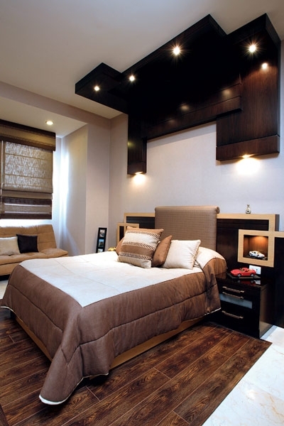 في الغرفة الرئيسة حيث اللونان البيج والبني تم تنسيق العمل بين ظهر السرير والسقف.