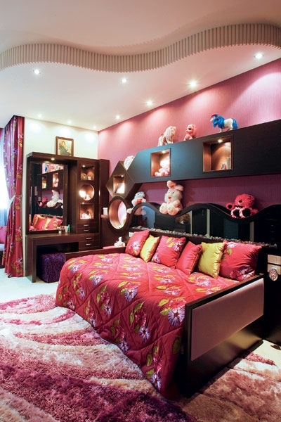 كما تناغمت الاشكال الهندسية في الخزائن والسقف وما فوق السرير.