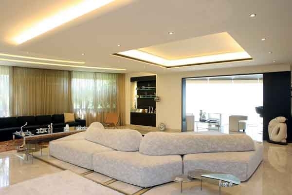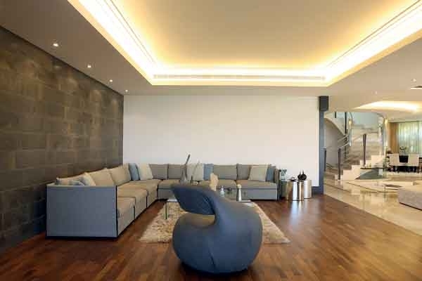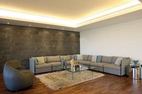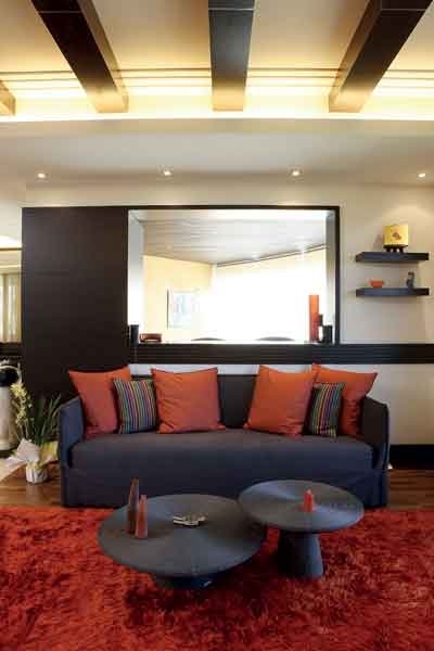 المقاعد الوثيرة والهادئة الألوان منتشرة في كلّ أرجاء المنزل، وتطالعنا من المدخل الذي تحوّل إلى قاعة جلوس بفضل مقعد لافت التصميم، لم تألفه العين، فيه شيء من الإبتكار وازدواجية الإستعمال، إذ إنّه شبه دائري ومقاعده كثيرة وفي الإتجاهين، لناحية المدخل الرئيسي كما لناحية الصالون الرئيسي.