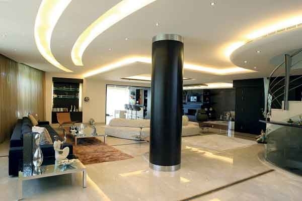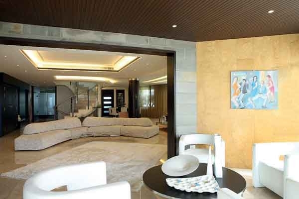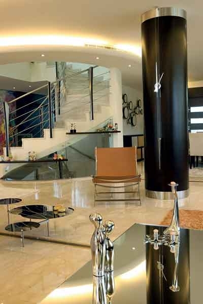 الابتكارات العصرية توزّعت على أربعة صالونات وغرفة طعام لم تفصل بينها حواجز، بل عمودان ارتديا الخشب وشكّلا جزءاً مكمّلاً للهندسة الداخلية، وعلّقت على أحدهما ساعة هي عبارة عن عقربين من الكروم.