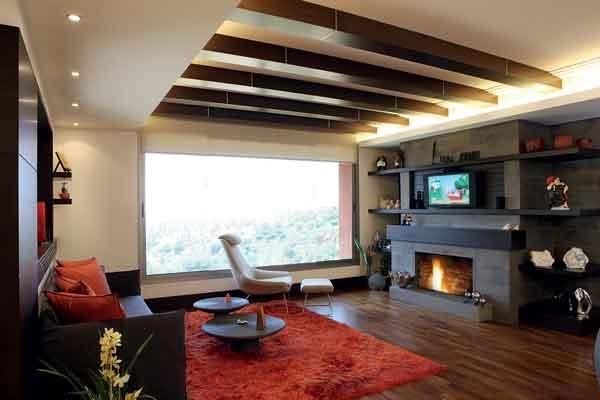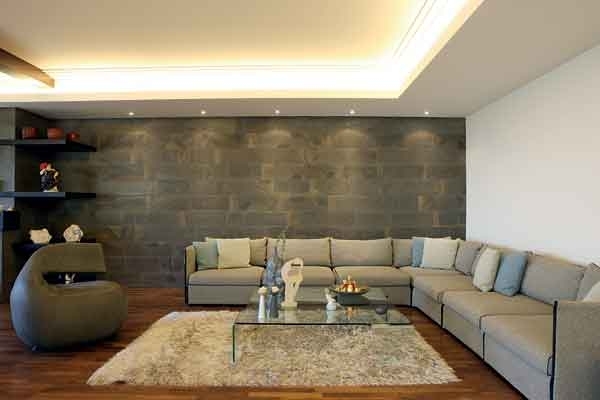 حائط المدفأة من الحجر الأملس الرمادي، وقد امتدّ نوع آخر من الحجر إلى جدار الصالون المقابل لاستكمال مشهد الدفء والحميمية.