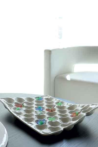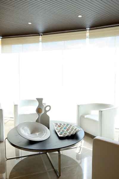 طاولة الوسط من مجموعة «Flexform» تزيّنت بأوان من البورسولان الأبيض بإمضاء «Paola».